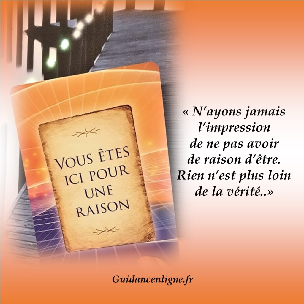 Cette carte de guidance nous rappelle aujourd’hui, que nous avons tous une raison d’être et que l’on a besoin de nous et ceci, quelles que soient les circonstances et le chemin que nous parcourons sur cette terre.
