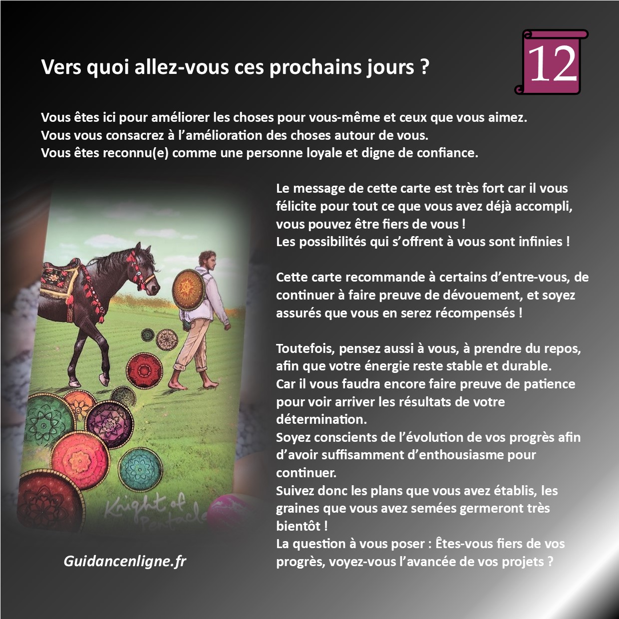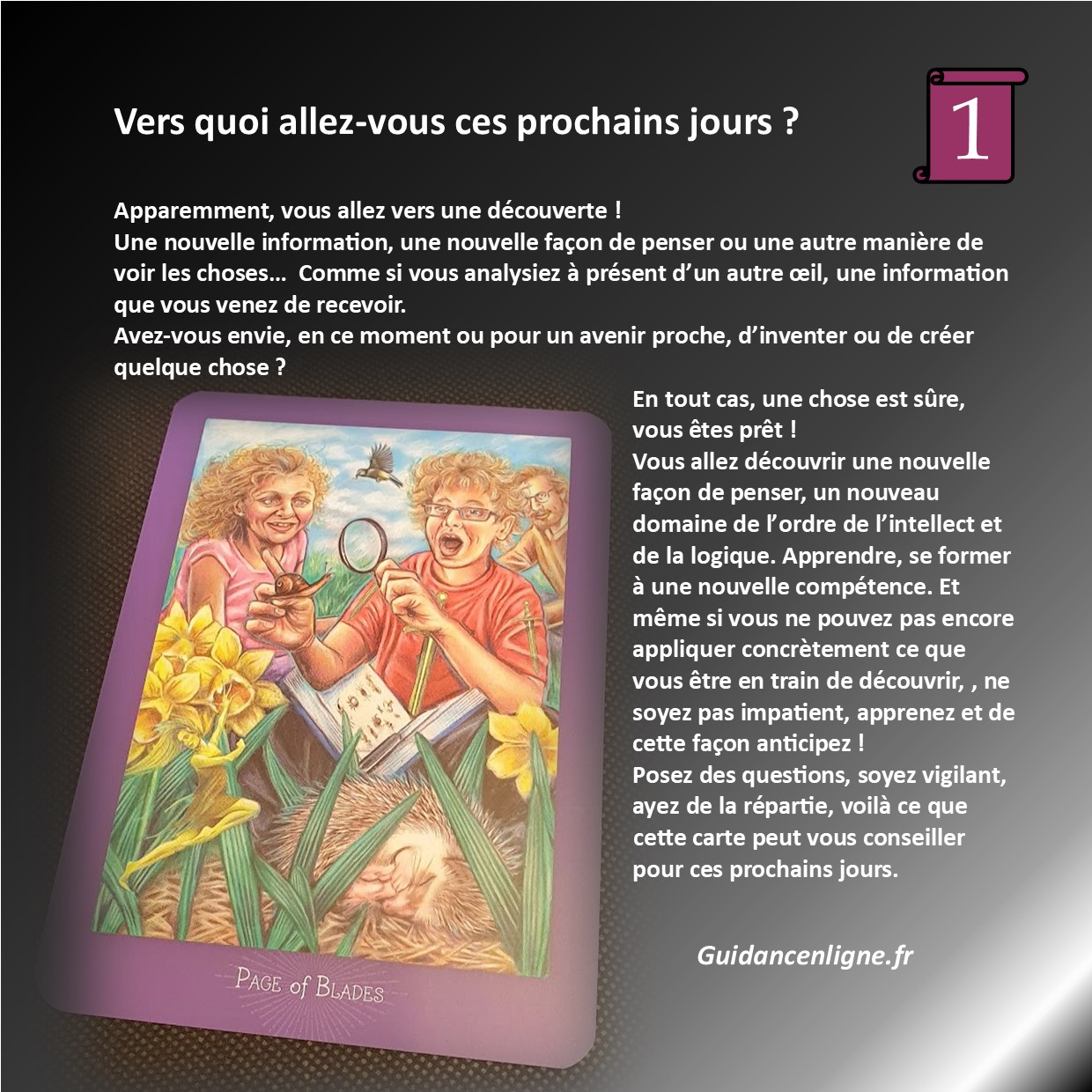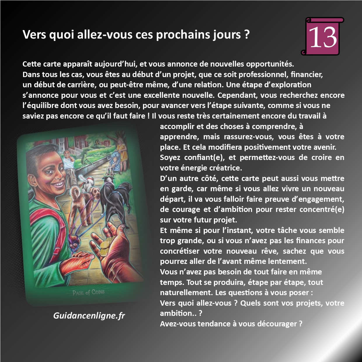 Vers quoi vais-je aller ces prochains jours ? Qu’est ce qui m’attend ? Comment vais-je avancer ? De quoi ai-je besoin en ce moment ?