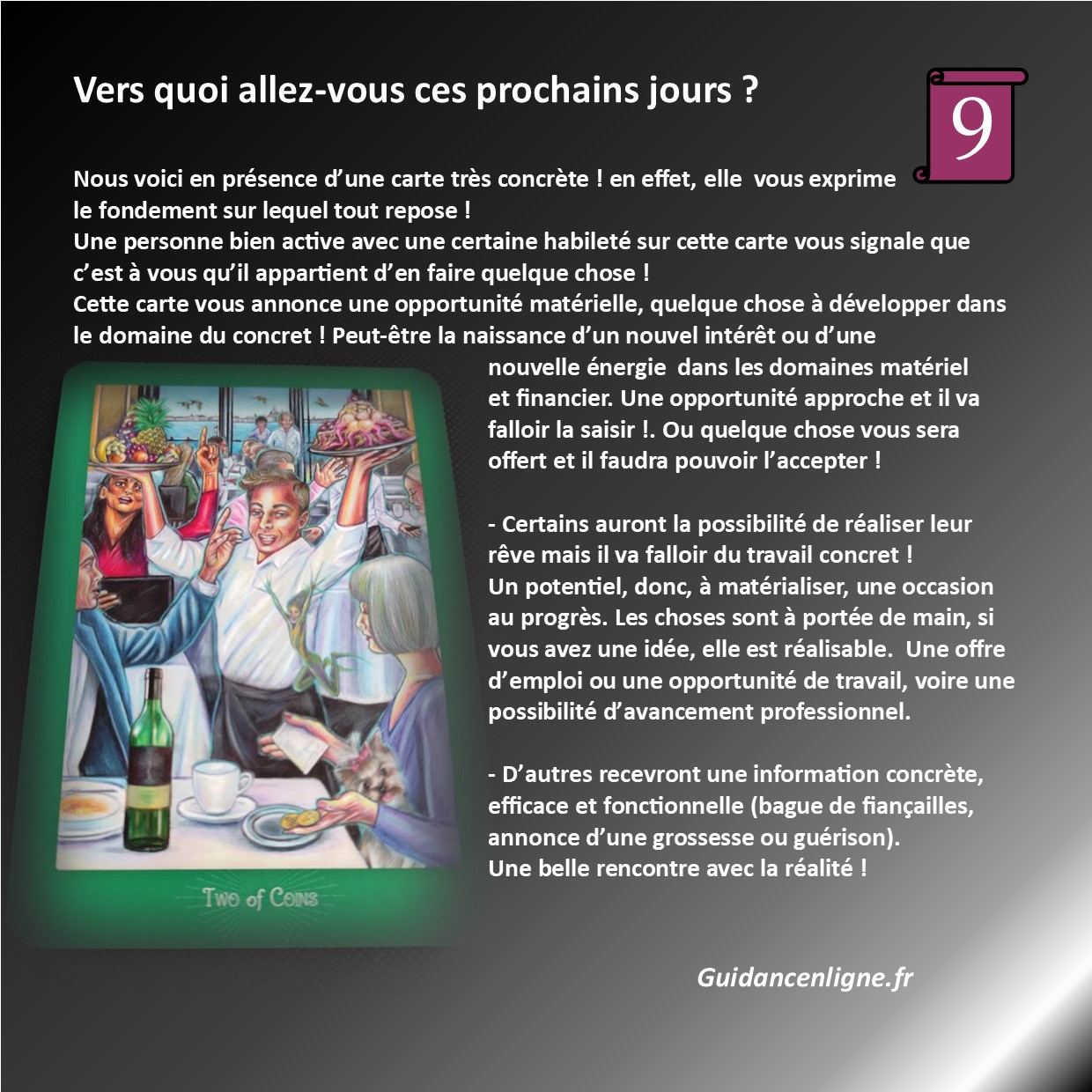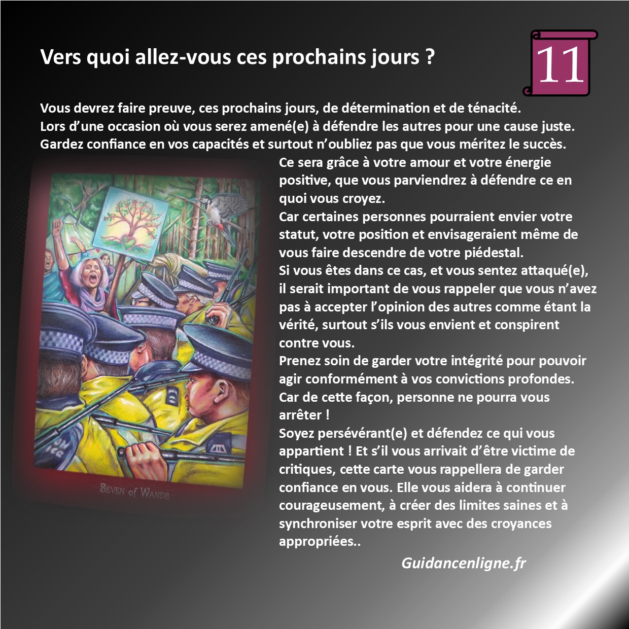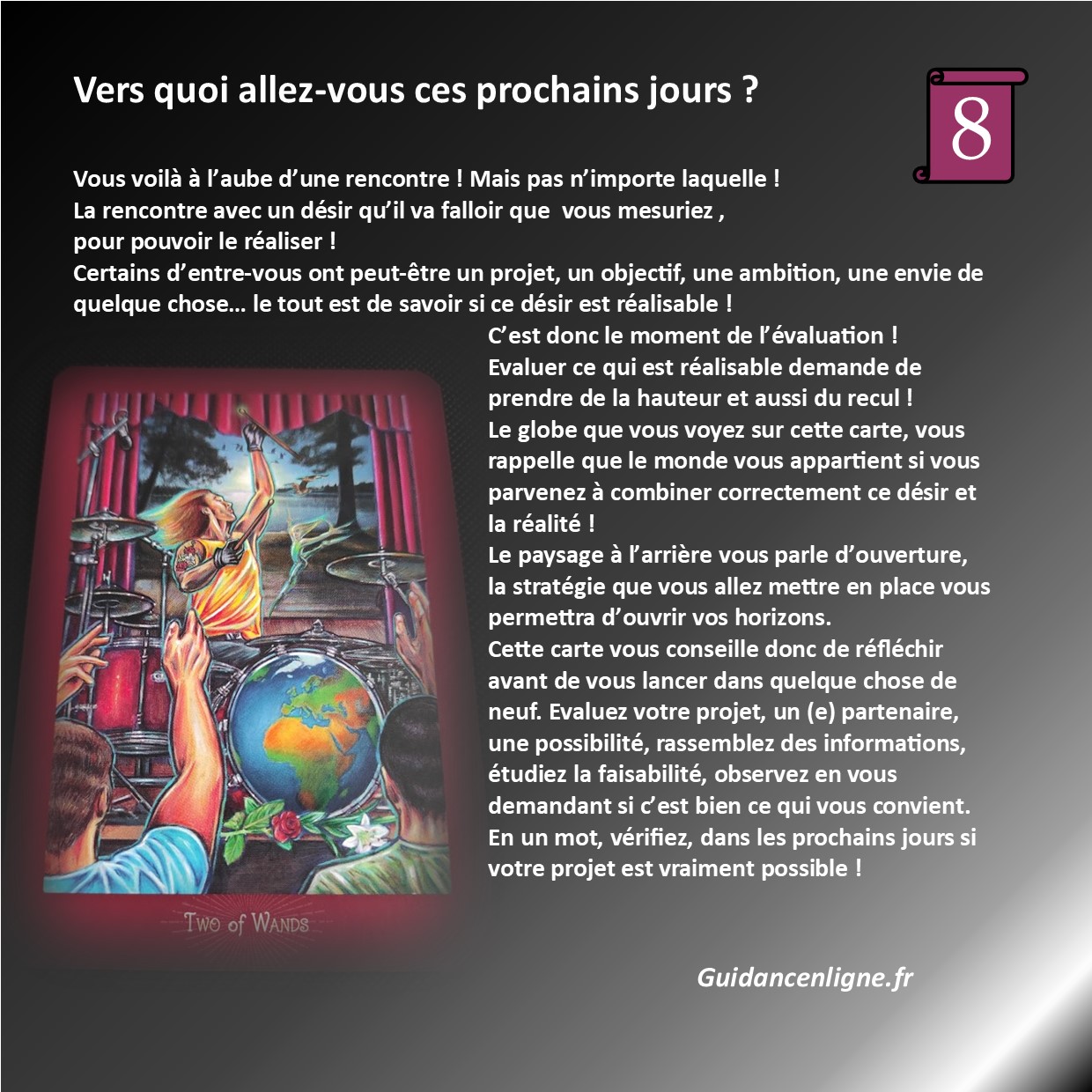 Vers quoi vais-je aller ces prochains jours ? Qu’est ce qui m’attend ? Comment vais-je avancer ? De quoi ai-je besoin en ce moment ?