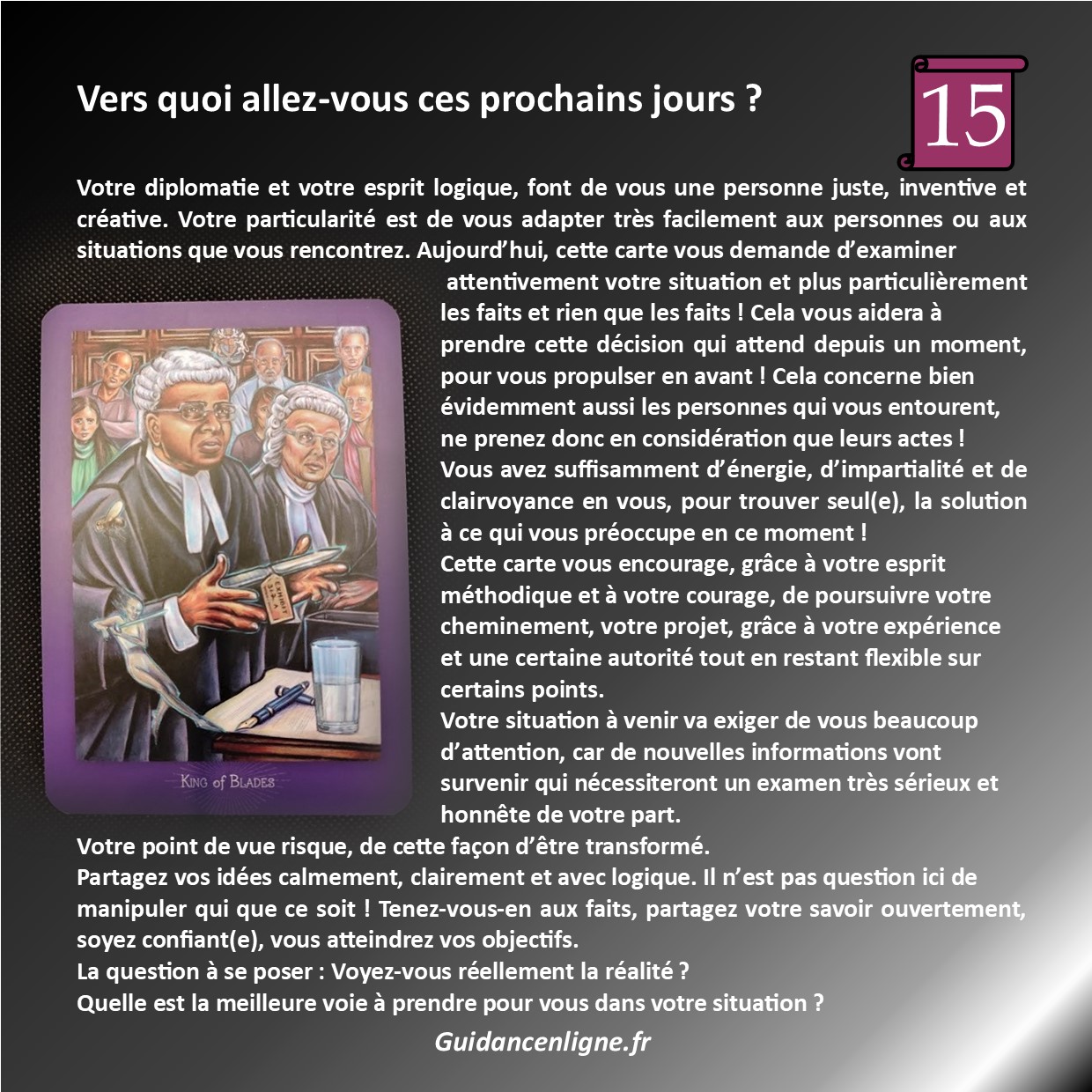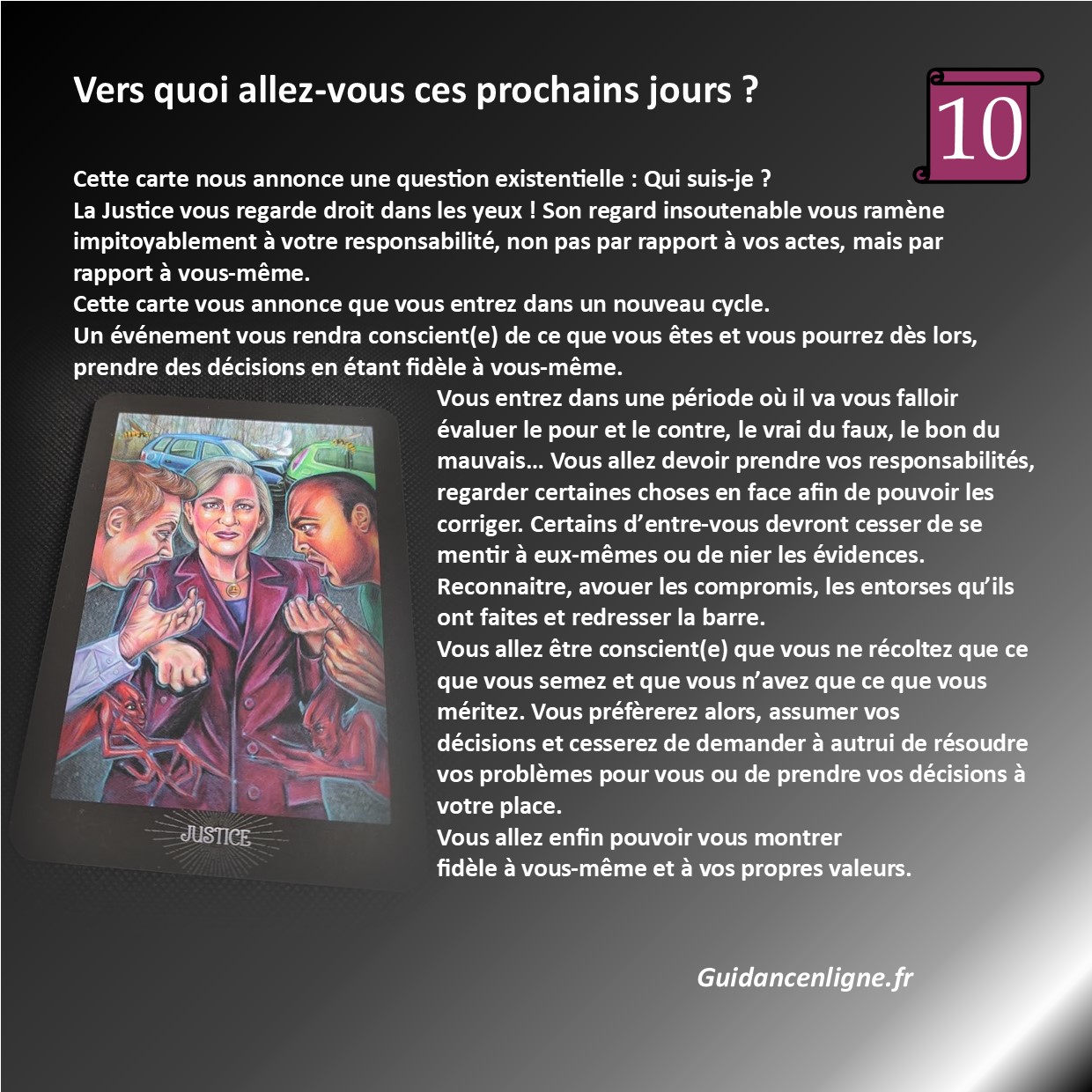 Je me relie, pour cela à mes connaissances en tarologie et cartomancie pour la méthodologie, ainsi qu’à mon intuition, comme je le ferais devant vous, en personne !